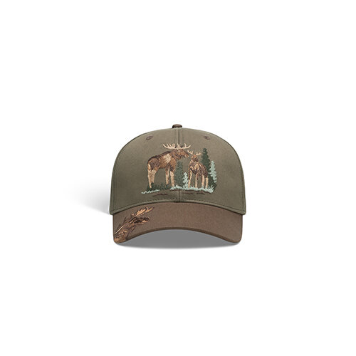 Klassisk av basebollformat i tvåfärgad mörkgrön bommullstextil med broderad älg på skärmen. Fram på kepsen en stor, detaljerad motivbrodyr sex färger samt flera enfärgade brodyrdetaljer runt kepsen.