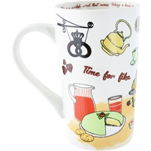 Hög mugg i porslin med fina tecknade motiv och en text på insidan om vad en riktigt svensk fika innebär.